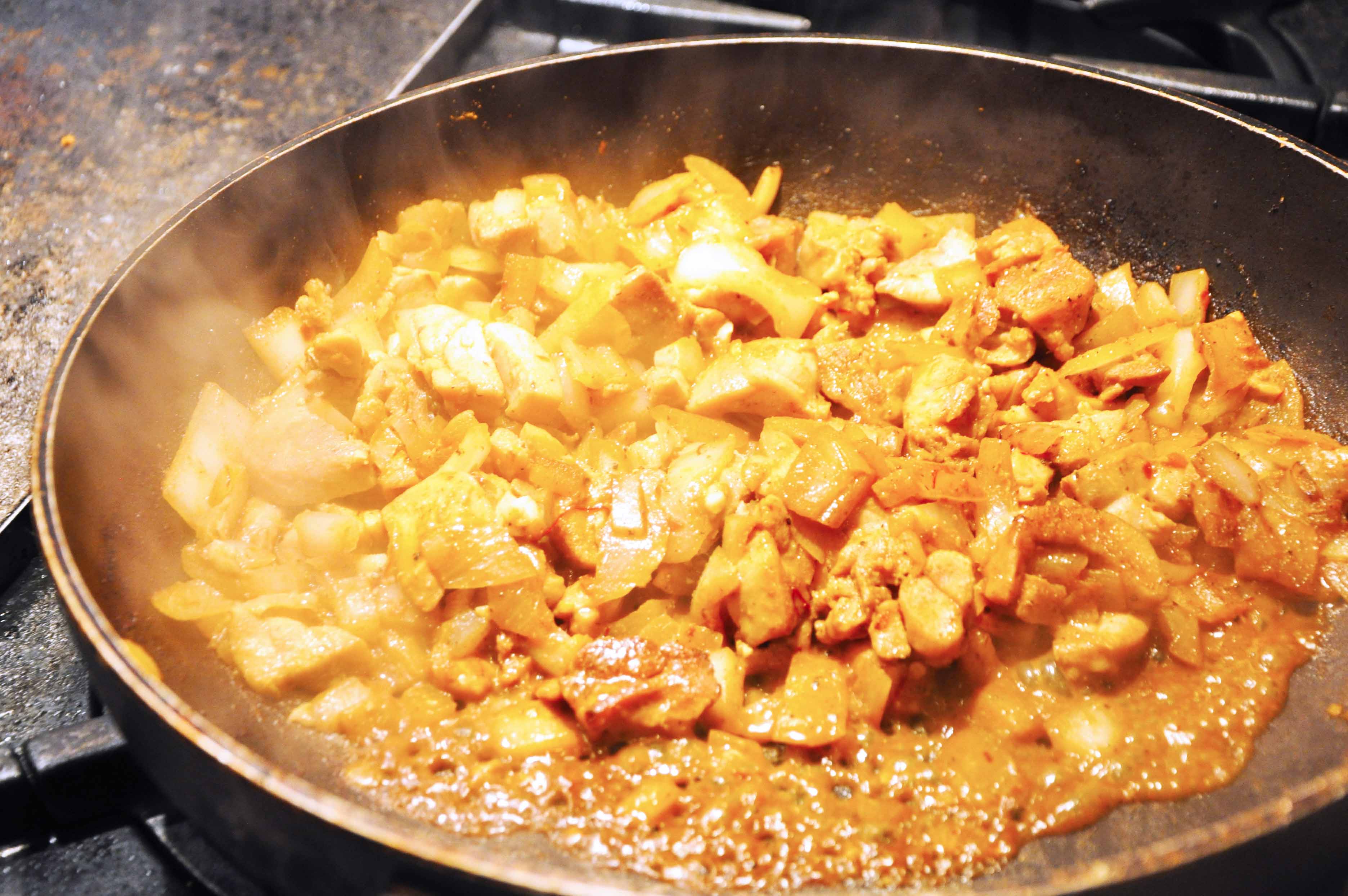 Step 1 – Place a large nonstick skillet (10″ or 12″) over high heat and add the Chicken and half the salt. Cook until the chicken has taken on some color and the juices are running out. About 3-4 minutes