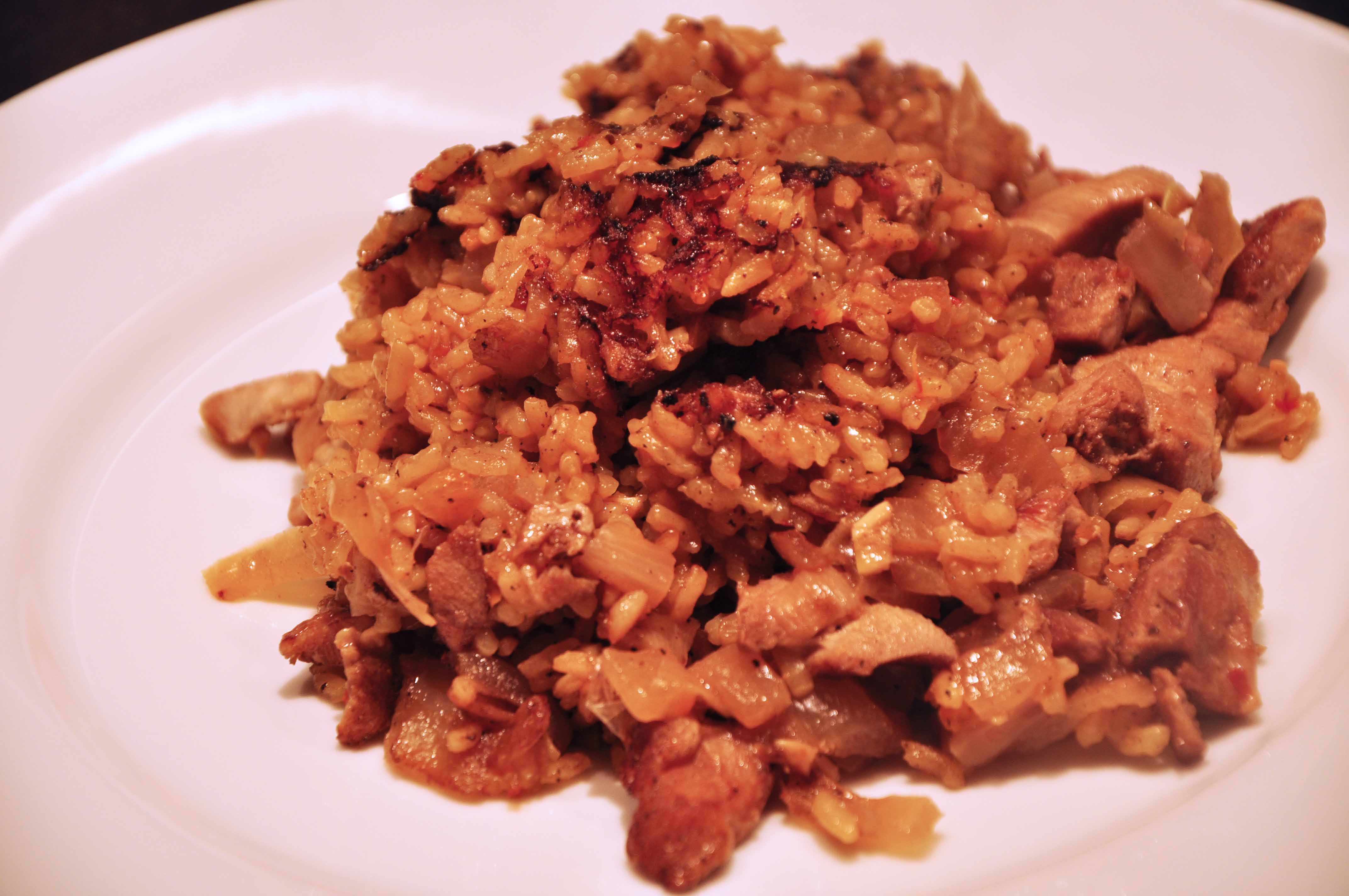 A word on the Chicken Traditinally this is a peasant dish. Chicken was not cheap in Cuba and so the rice was used to extend this pricey meat. In most of the developed world chicken is now very affordable, if not the most affordable protein on the market. So as you can imagine it came as a shock to me why my grandmother loved chicken so much. I remember asking my mom about this when I was younger and her responce was that it was the equivient of us moving to a country where Filet Mignon was 90 cents a pound. The reason I bring this up is to drive home the point that the chicken in this recipe is a luxury and should be treated as such, so buy good chicken, organic if possible. Also, this dish really comes out better with chicken thigh. For this version I use boneless skinless chicken thigh but if I have more time I really like using chicken thigh on the bone. I do not recommend chicken breast for this dish, it comes out too dry as it has to cook for over 40 minutes. The thigh meat on the other hand becomes tender with the long cooking and imparts far more flavor to the overall dish. If you are concerned about fat you can always add the chicken to the hot skillet without oil and cook it until it’s rendered all it’s fat. Before adding in any of the other ingredients, move the chicken onto a plate lined with a paper towel and remove any excess fat in the pan with another paper towel. I do this sometimes and it comes out delicious all the same, all be it with less of the unctuous mouthfeel I grew up loving.