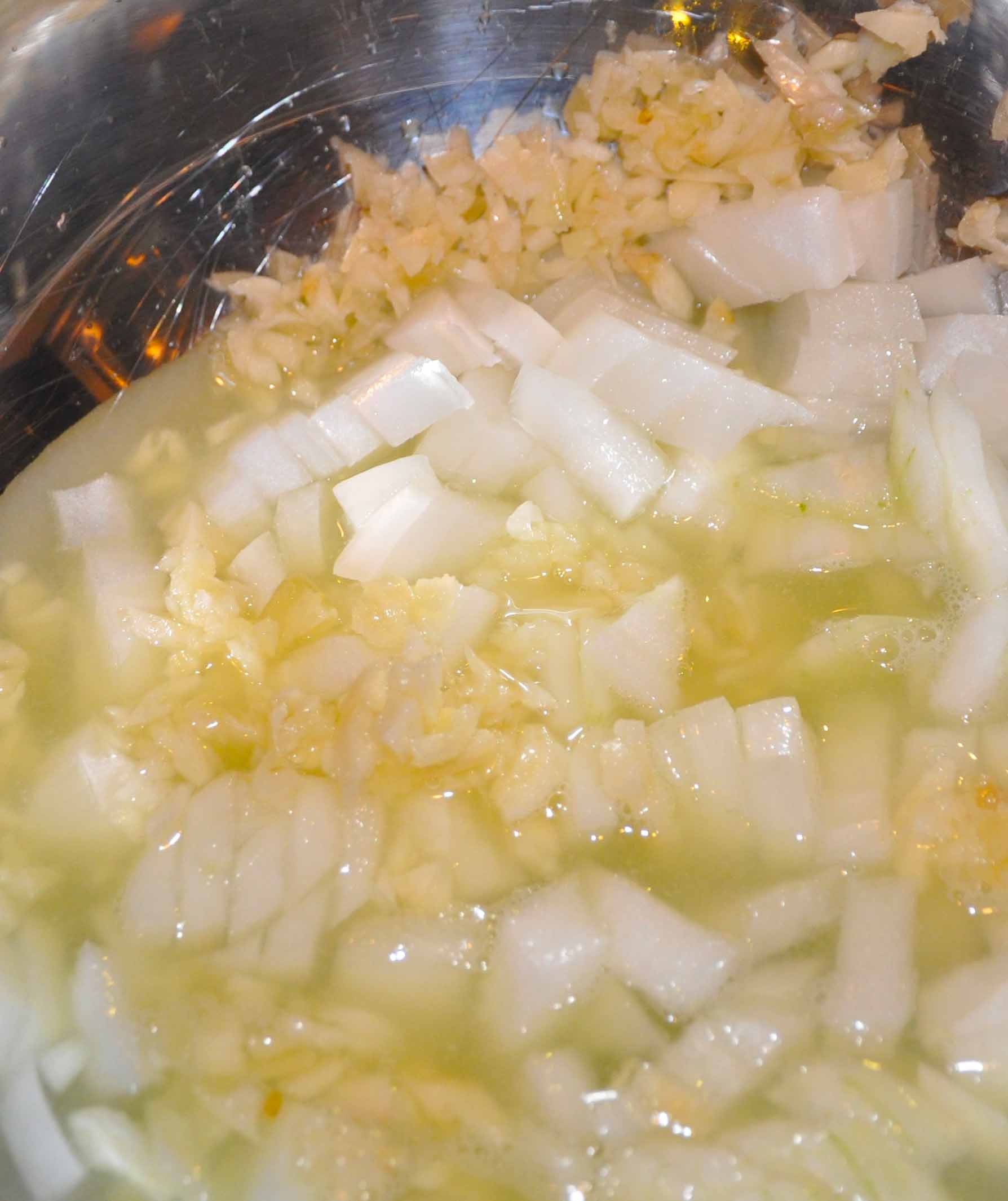 Finely dice the onion and crush the garlic then place in a zip top bag.