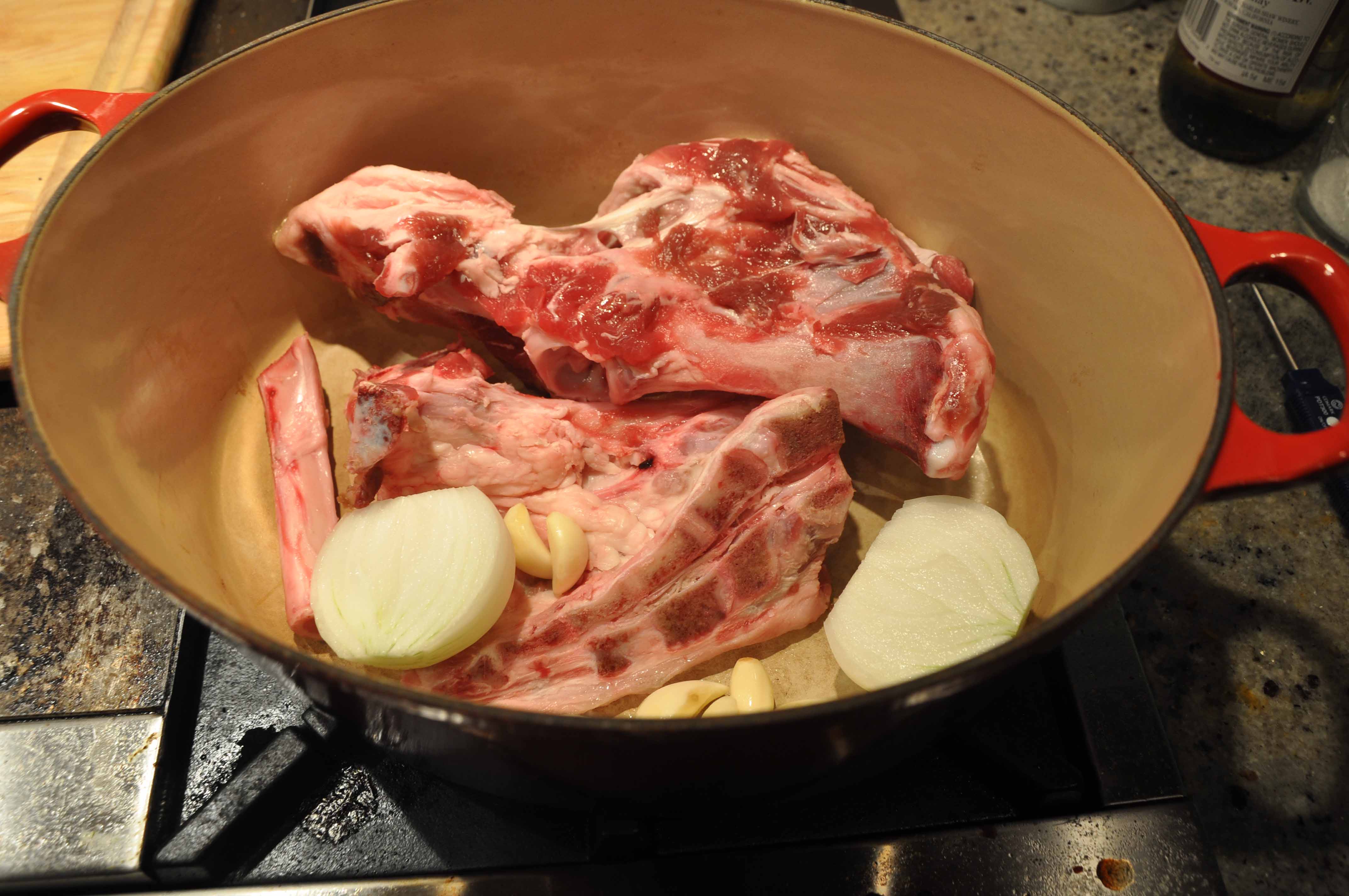 Place the bones, onion and garlic into a Dutch Oven and place in hot oven.