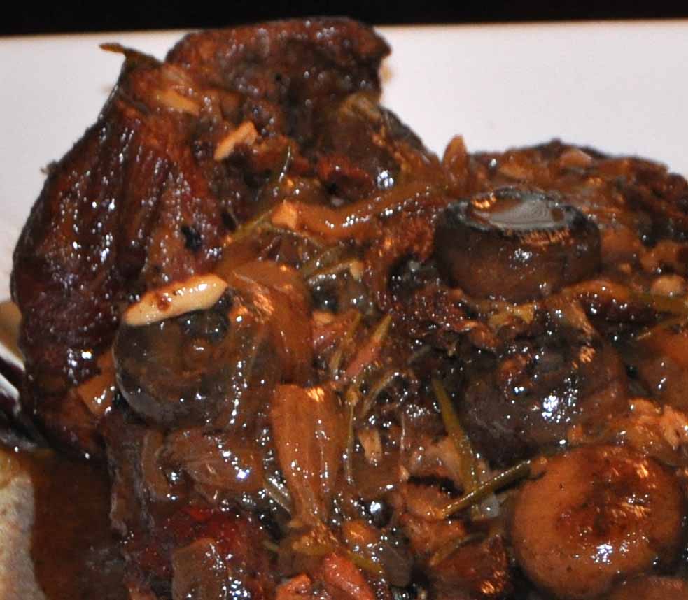 Next add four cups of stock, the rosemary and dried mushrooms. Bring to a boil and carefully transfer to the pre-heated oven. You will want to check on the lamb roughly every 20-30 minutes, adding more stock as needed, I usually go through another 2 cups but you might need more or less. Cook until it is tender and falling apart, roughly 2 hours.