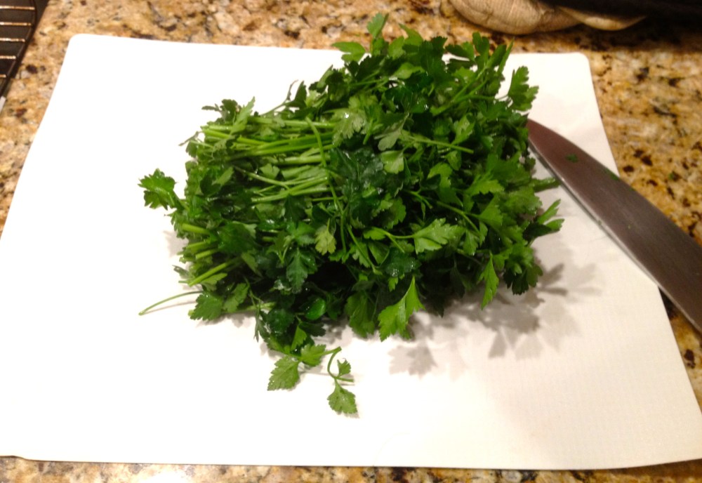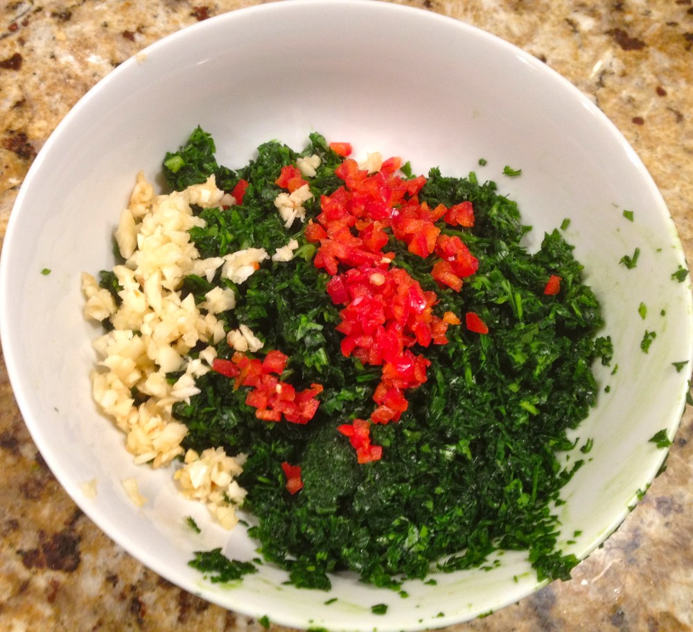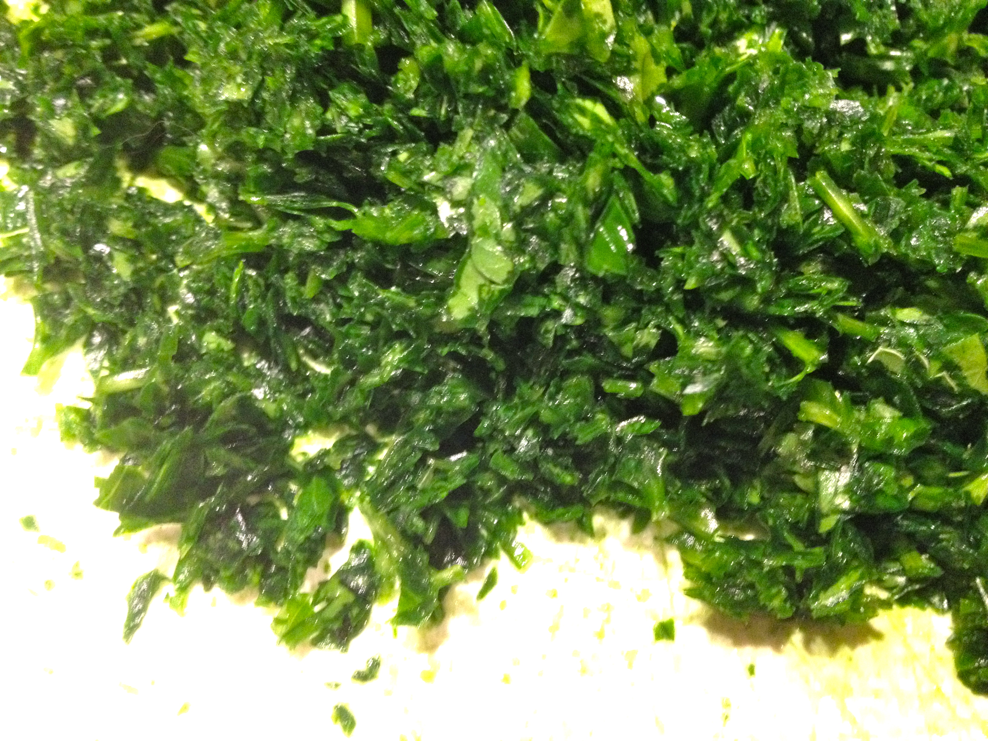 This really comes out better if it’s made by hand, I think it has to do with the mouth feel of the rougher, less uniformly chopped parsley, that is why I chose this method for the post; however, I admit I am lazy and most times I just make it in the food processor. That said it is not hard to chop the parsley by hand, it just requires patience and a little practice. More importantly, the lack of a food processor should not be an excuse for not making this dish. If you are going to use the food processor, remove the parsley, garlic and peppers from the processor before adding the liquid and seasoning to taste. Either way it will turn out delicious!