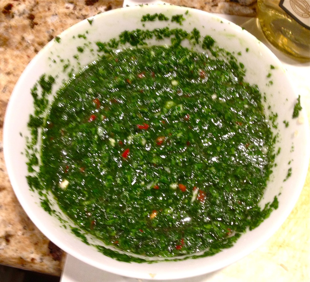 When we were much younger my father used to take us frequently to an Argentinian restaurant in Miami, and I think it is here that I learned to love beef. I also learned to love the piquant sauce they put on their meat called Chimichurri. It is a tangy sauce of parsley, garlic, red chili pepper, vinegar and a little olive oil which is much greater than the sum of its parts. In our house we spread it on everything, from fish to beef to bread; it also makes a great pasta sauce should you have some of it left over from a grill session.