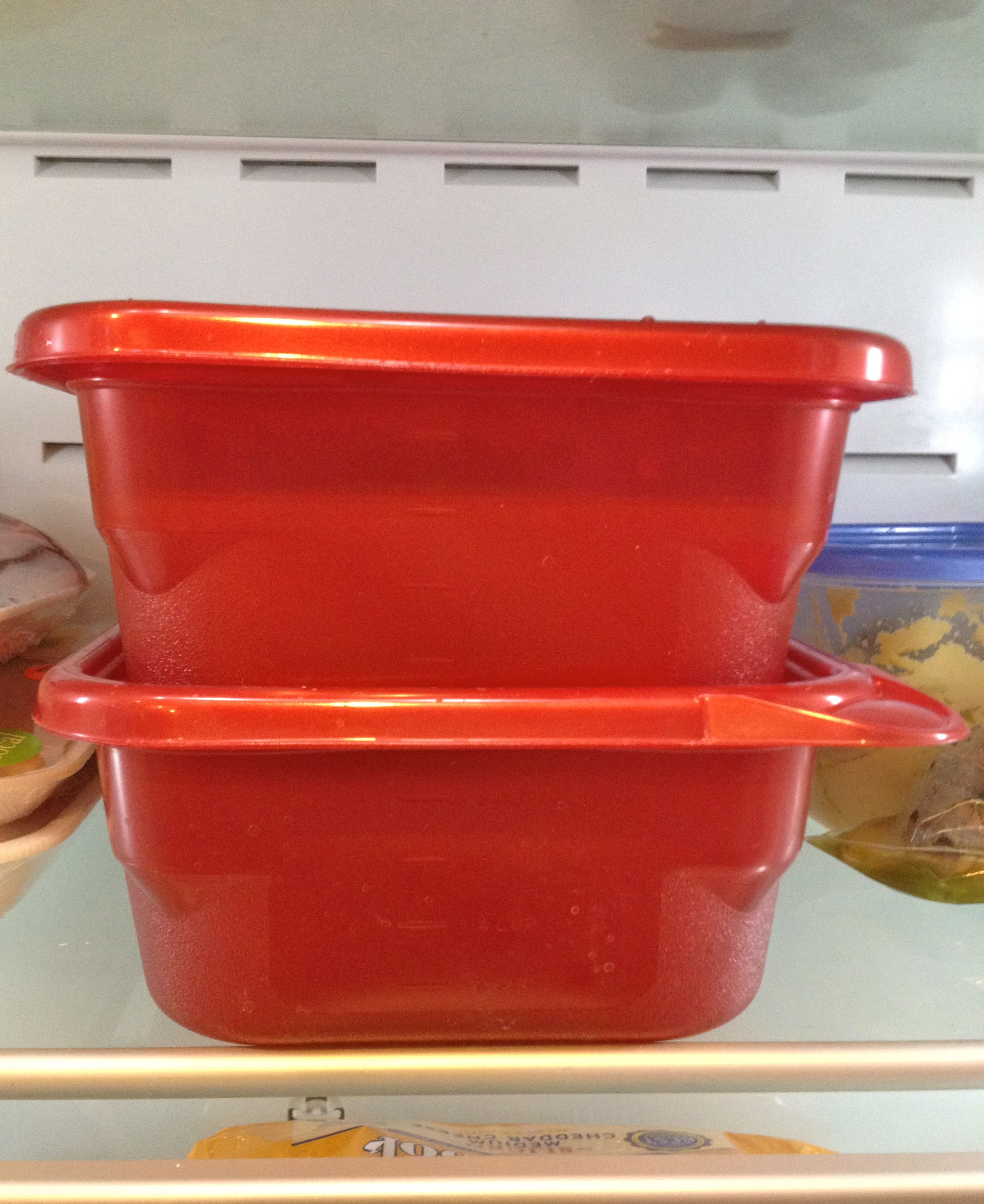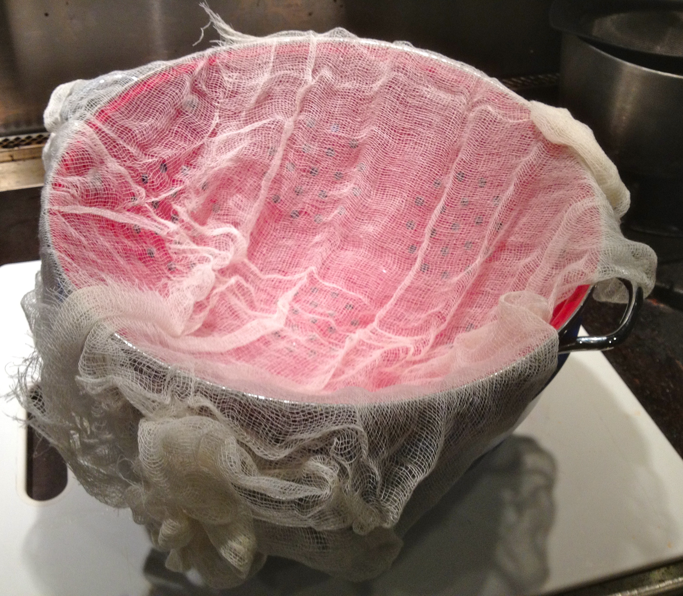 Once the stock is ready, place a fine sieve over a bowl large enough to hold your stock. If you do not have a fine sieve you can use a colander lined with a few layers of cheese cloth as I have done here. Transfer to the refrigerator and allow to cool over night. Once the fat has solidified you may skim it and transfer the stock to its final resting place/vessel. Personally, I like to fill zip top freezer bags and lay them flat in the freezer as it makes it easier to thaw the sauce later on.