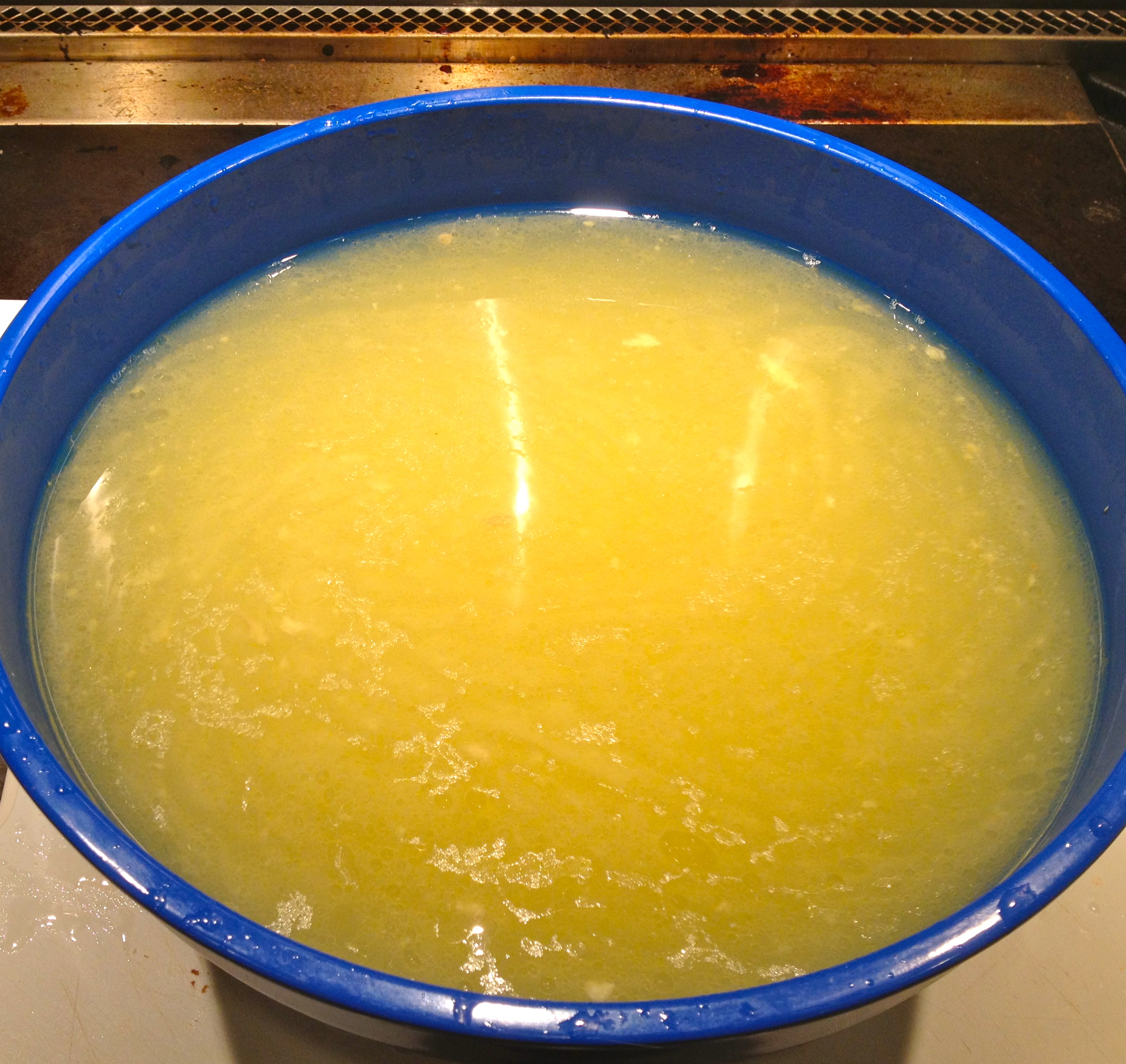 If for some reason the fat does not solidify well and you can’t seem to skim it off properly, you may freeze the stock. The fat will rise to the top and the whole thing will freeze, it is then very easy to scrape it off. If you need to use the stock right away I would suggest investing in one of those little fat separators that look like measuring cups with the spout coming from the bottom. They have worked very well for me in a pinch.