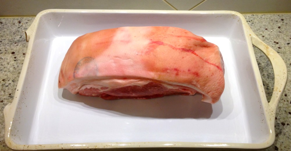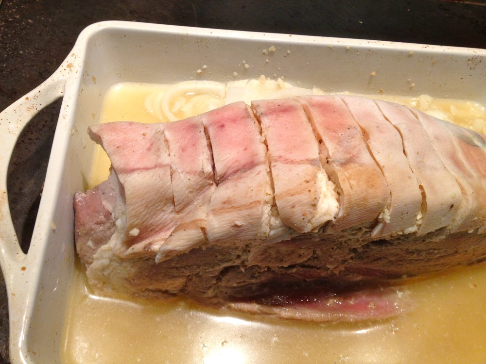 Slice the skin on the pork so that you slice through the skin and expose the fat. It’s best to not cut all the way to the meat but don’t worry too much if you do. Pierce the flesh with a knife 8-12 times.