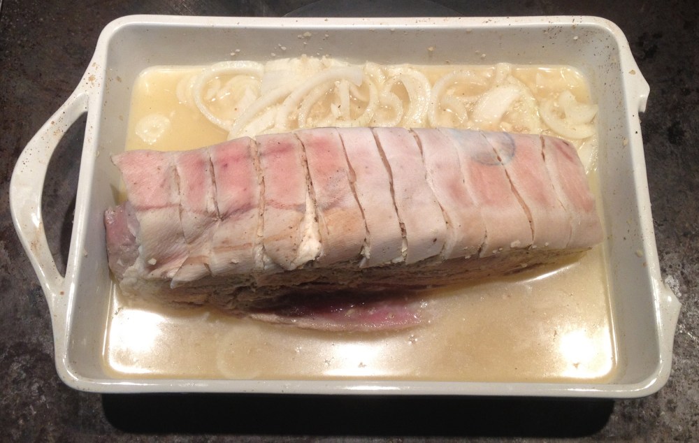 Rub the roast well with salt, pepper, cumin and garlic. Rub it in well, making sure that you get it all the cuts and piercings you have made in the roast. Once it’s had a good massage, place it in a large baking dish with a sliced onion, squeeze the limes over the roast, cover it with plastic wrap and place it in the fridge.